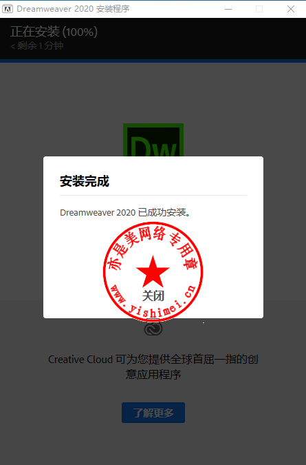 Adobe Dreamweaver 2020安装完成,点击“关闭”。